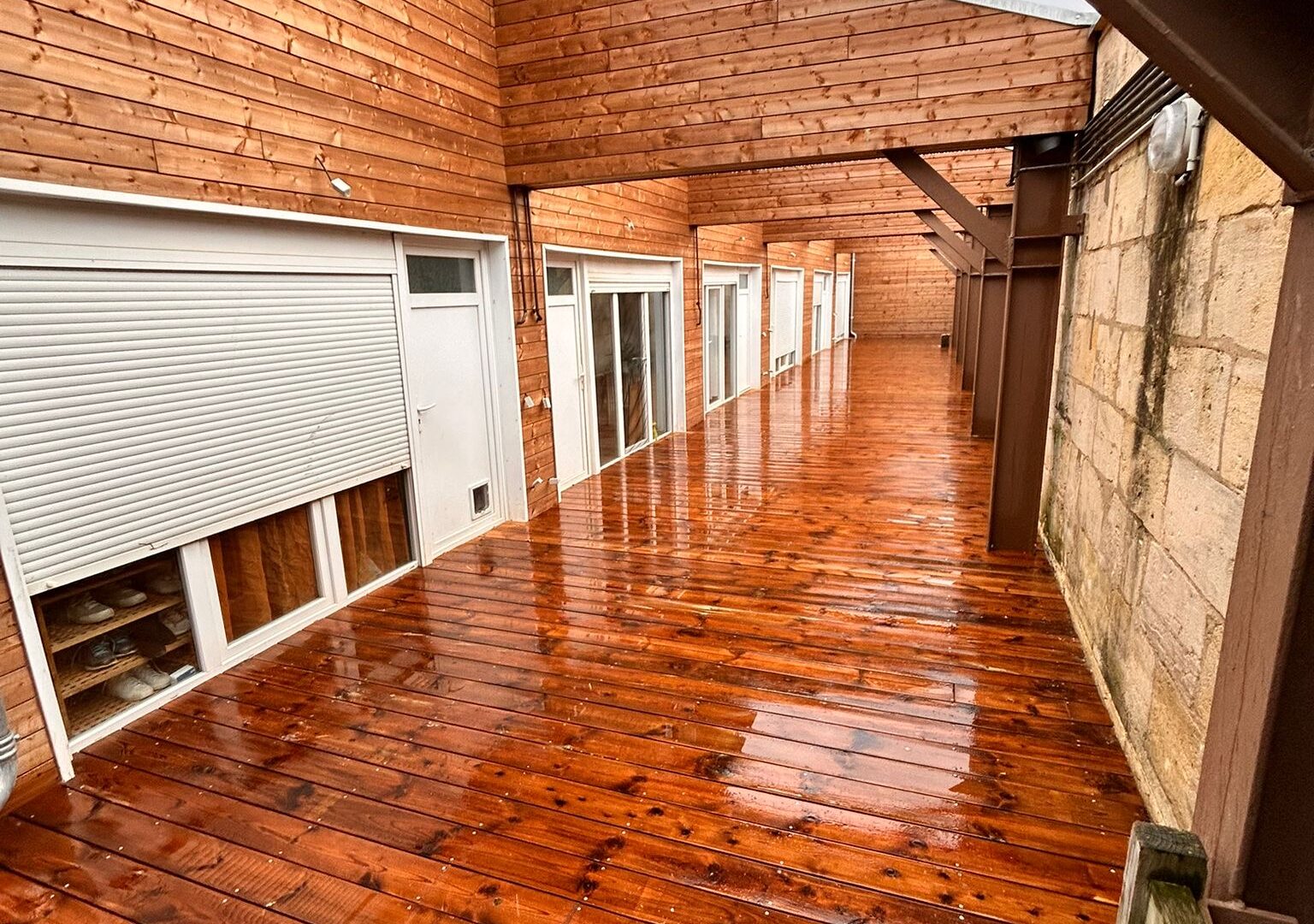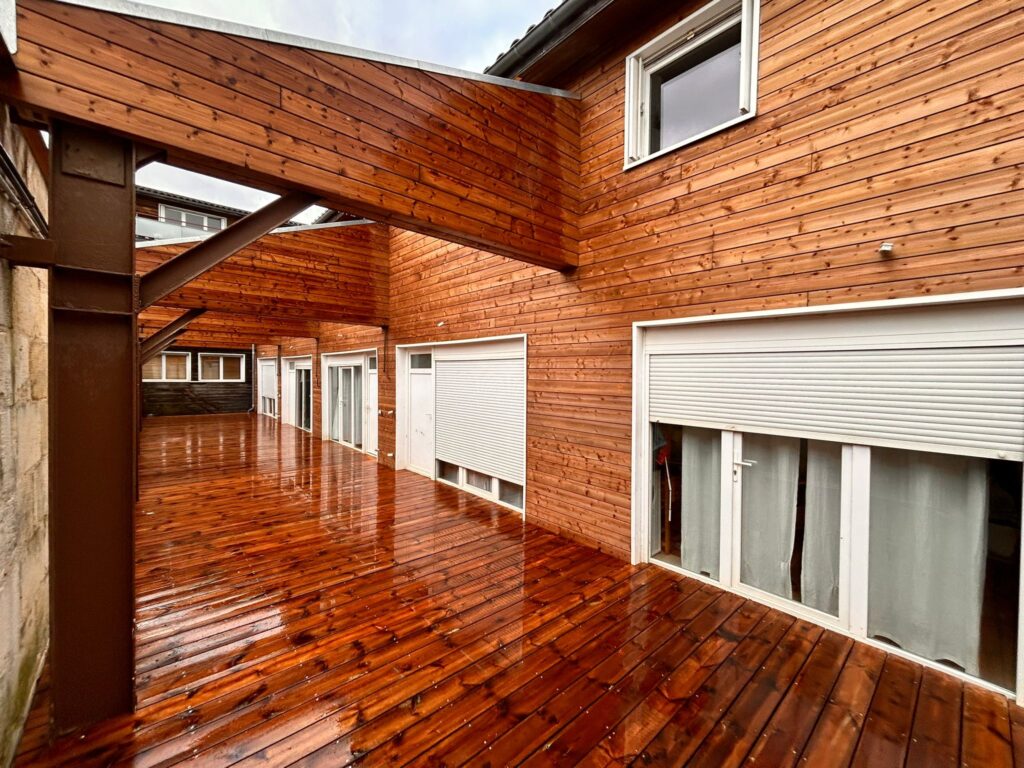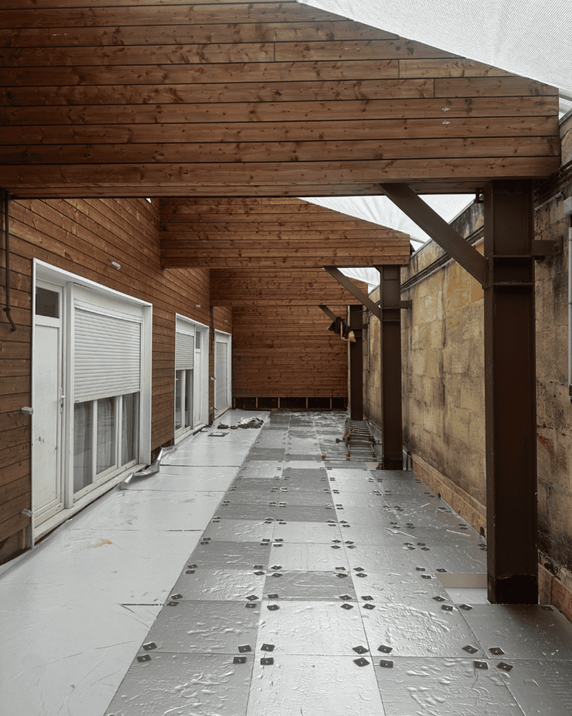 La sécurité des résidents a été une priorité tout au long du chantier. Les travaux ont donc débuté par une dépose partielle de l’ancienne terrasse bois, réalisée sur un seul côté, afin de maintenir une circulation sécurisée et continue pendant toute la durée de l’intervention.